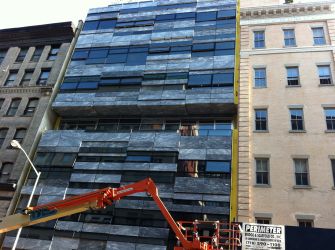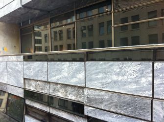 Facciata in marmo Azzul Lagoa lavorato in tre tipologie: Marsello di marmo a spessore 2/3 cm, Marmo sottile 4 mm su supporto alveolare in alluminio “Honeycomb”, marmo sottile 4 mm laminato a pannelli di vetro camera tipo “Shuco” quantità circa 300 mq.